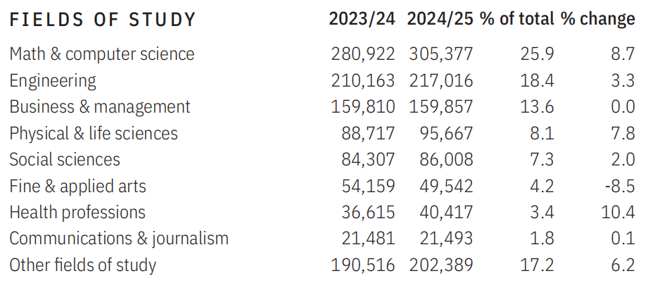 专业排名已连续多年稳定:数学与计算机科学以305,377人(26%)居首,工程类217,016人(18%)次之,商科与管理159,857人(14%)位列第三。这一格局体现了全球学生的共识——优先选择高适配性、高回报率的专业。
