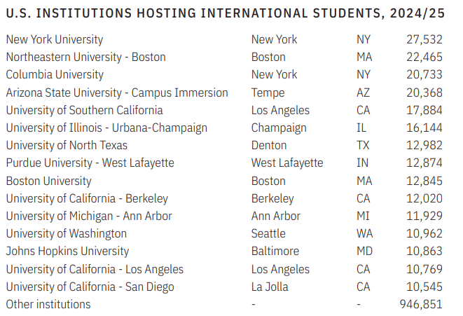 国际生最多的五所大学为纽约大学、东北大学、哥伦比亚大学、亚利桑那州立大学、南加州大学。