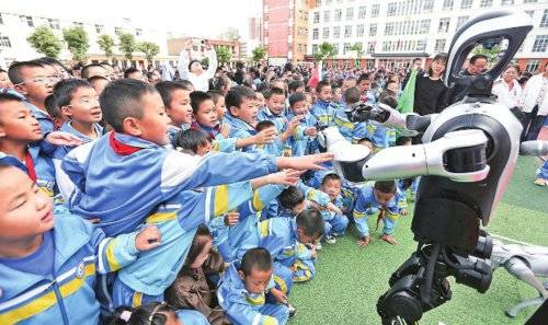 日前,甘肃省定西市安定区西关小学举办校园科技节活动,现场通过科普讲解、互动体验、科普展览等,让学生们近距离感受科技的魅力。图为学生和人形机器人互动。新华社