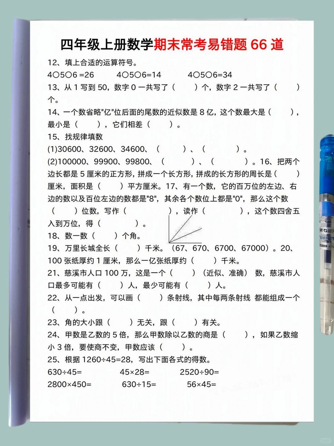 这份四年级上册数学期末常考易错题 66 道,聚焦期末高频易错考点,涵盖数的认识、运算、几何、统计等模块,以填空题、判断题等题型呈现典型易错内容,是期末查漏补缺的针对性训练内容。