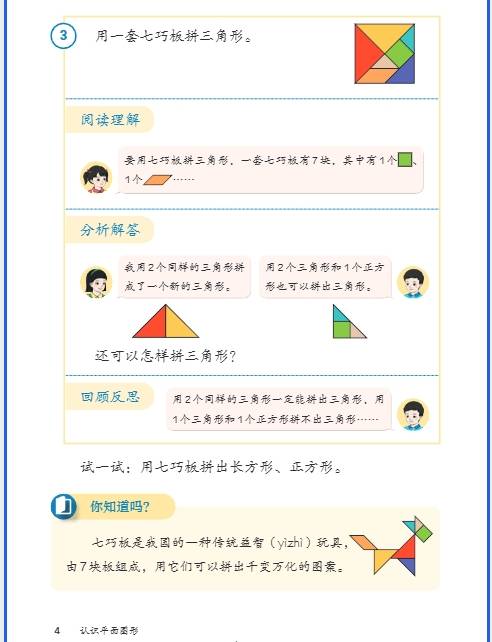 - 认识图形(二)这一单元聚焦平面图形,是上册立体图形知识的延伸。需认识长方形、正方形、平行四边形、三角形和圆这五种基本平面图形,掌握它们的特点,比如正方形四条边都相等,圆是曲线围成的图形等。同时还要学习图形拼组,比如两个相同的三角形能拼成平行四边形,并且能准确数出组合图形中基本图形的个数。