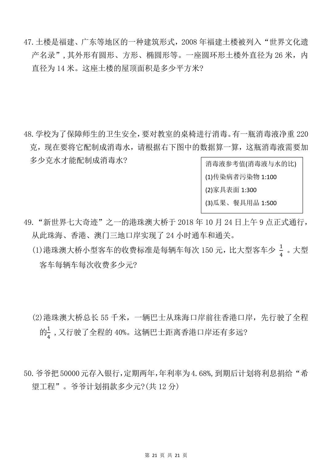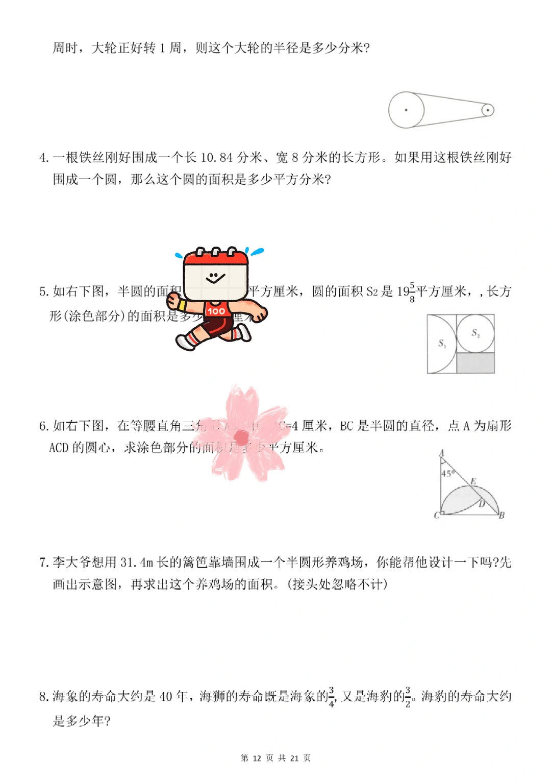最后是能力培养踩准六年级 “应试 + 应用” 的双目标—— 六年级既要 “练会做题”,也要 “学会用数学”,这份资料里的 “消毒液配比(按比分配)”“港珠澳大桥距离计算(分数乘法)”,把数学和生活场景绑定,教学生用 “数学模型解决实际问题”;而 “圆与长方形组合图形面积”“皮带轮半径计算(周长相等)”,则练会几何图形的转化思维,为初中几何打基础。