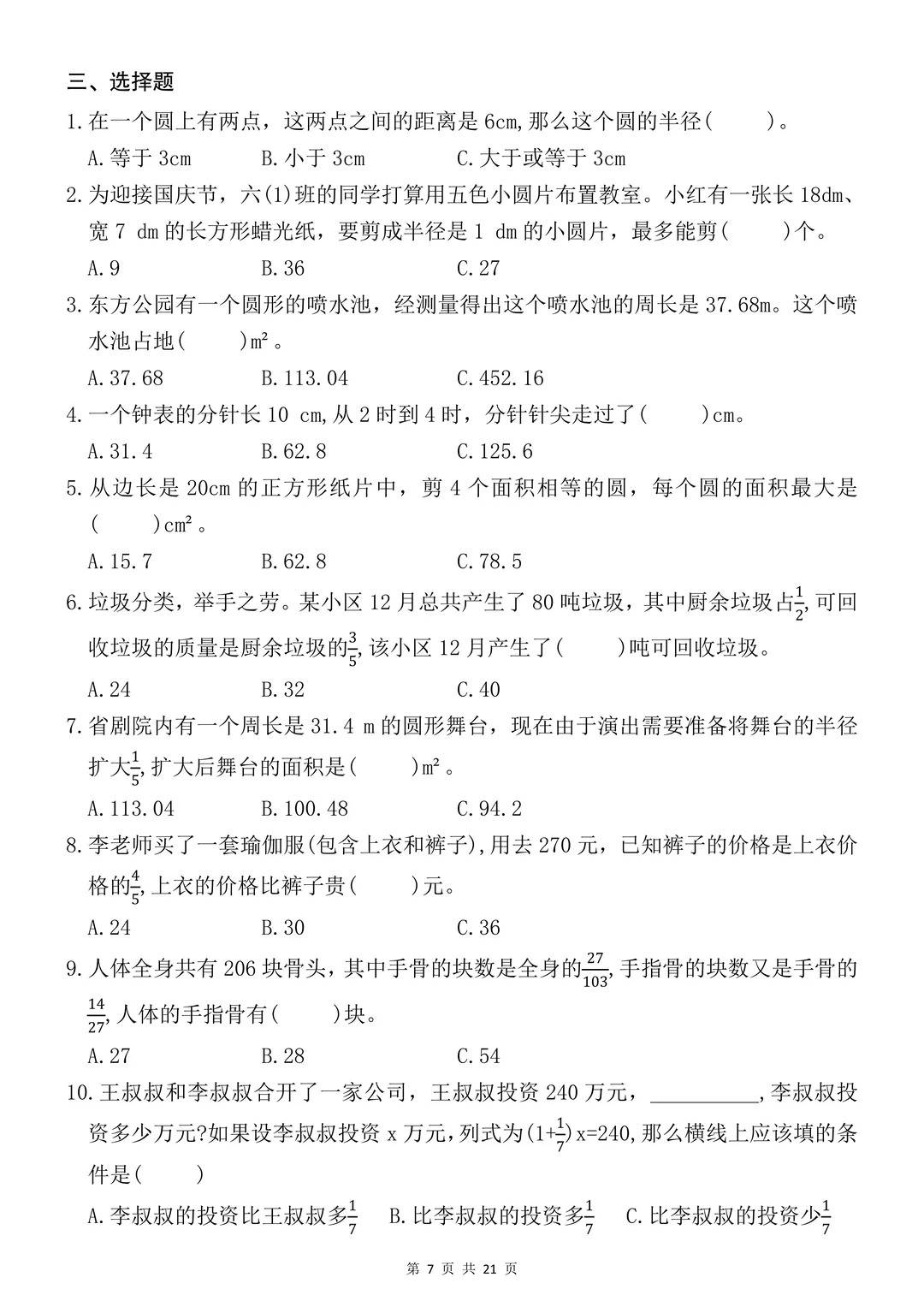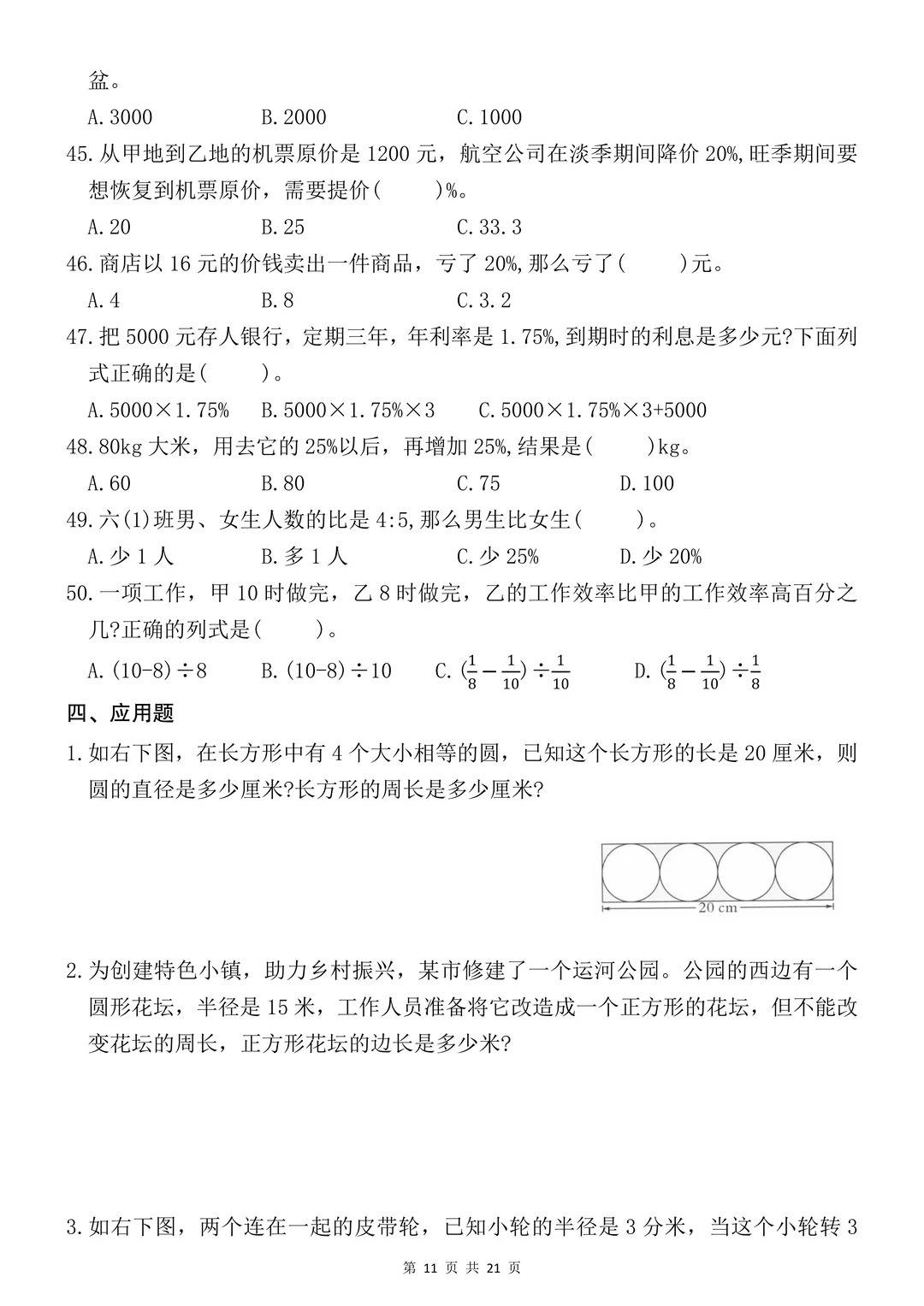 六年级上册数学期末高频易错真题太顶了!这波资料直接把 “圆的计算 + 分数应用” 两大难点焊死~先划重点:这份资料是北师大版六年级上册数学期末真题精选,涵盖 ** 圆的周长 / 面积(环形面积、圆与长方形 / 正方形组合图形)、分数乘除(量率对应、比与百分数)、百分数应用(折扣、利率、利润)** 等核心题型,还有 “土楼屋顶面积、港珠澳大桥收费” 等生活实例,连 “环形小路面积、铁丝围图形变圆” 这类易错题都安排得明明白白,内容从基础计算到综合应用全维度覆盖!