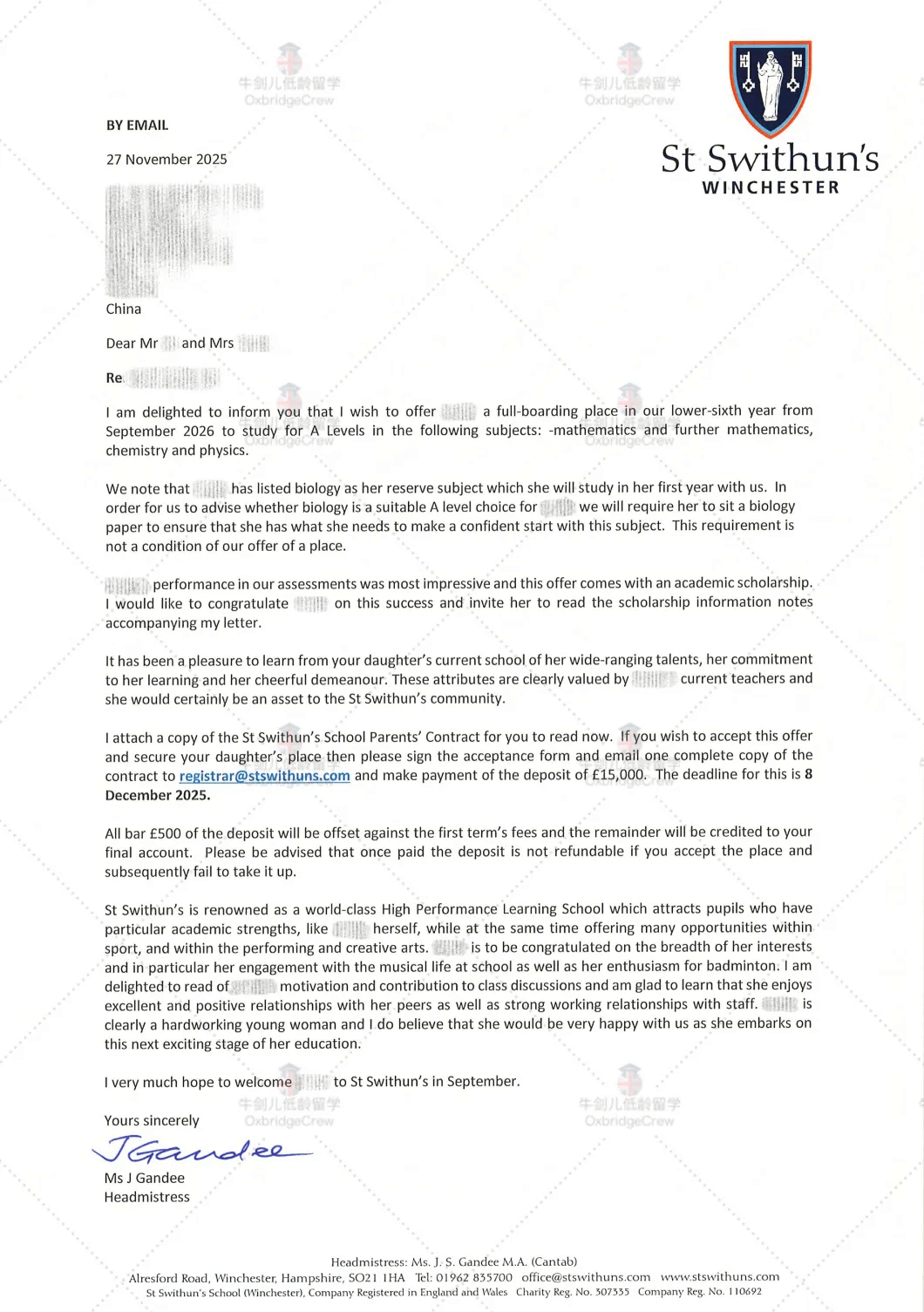 其中St Swithun's School(圣斯威辛学校)还为小E同学提供了学术奖学金!