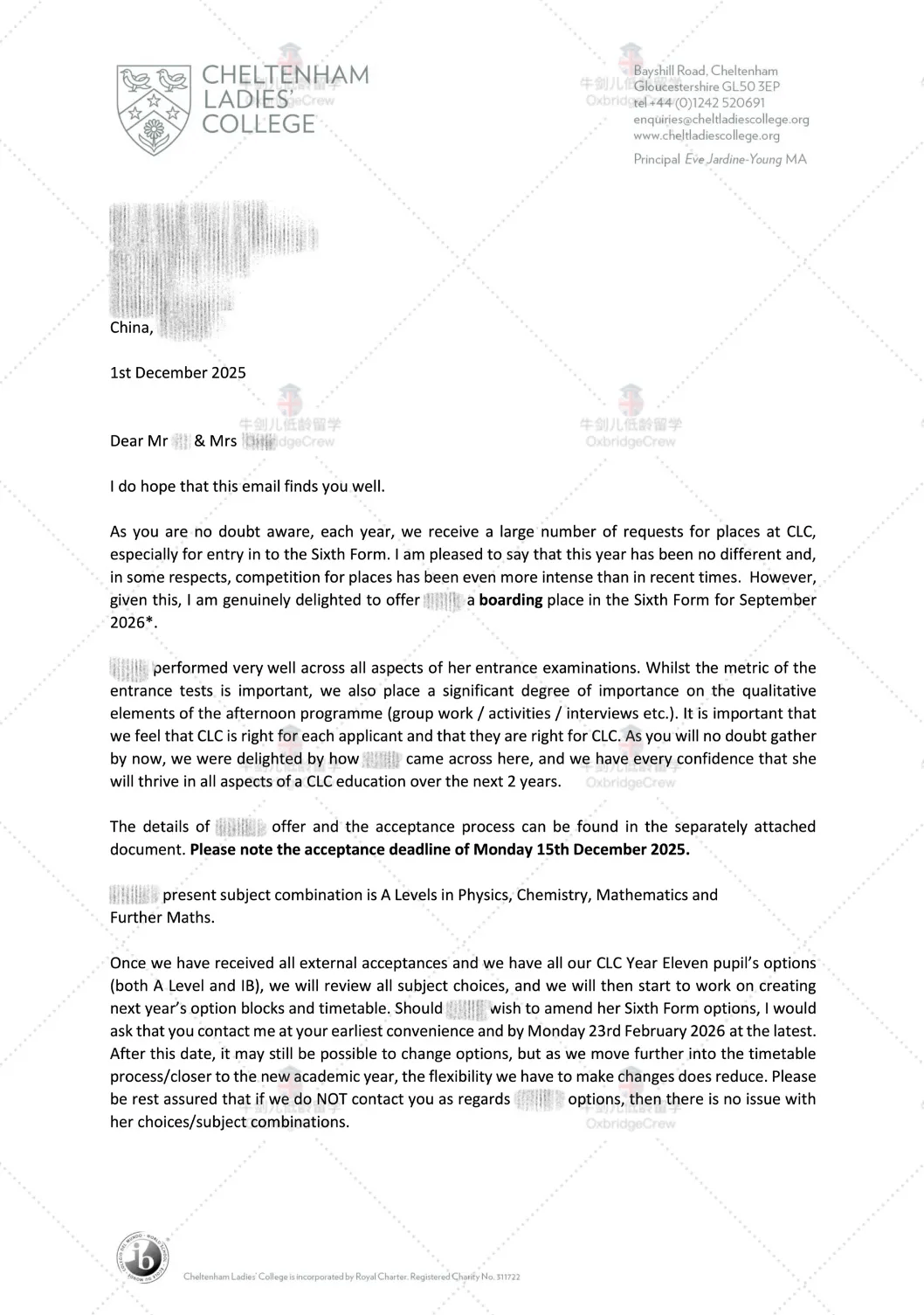 学校背景:此前就读于国内双语学校;后通过牛剑儿申请到英国私立中学就读