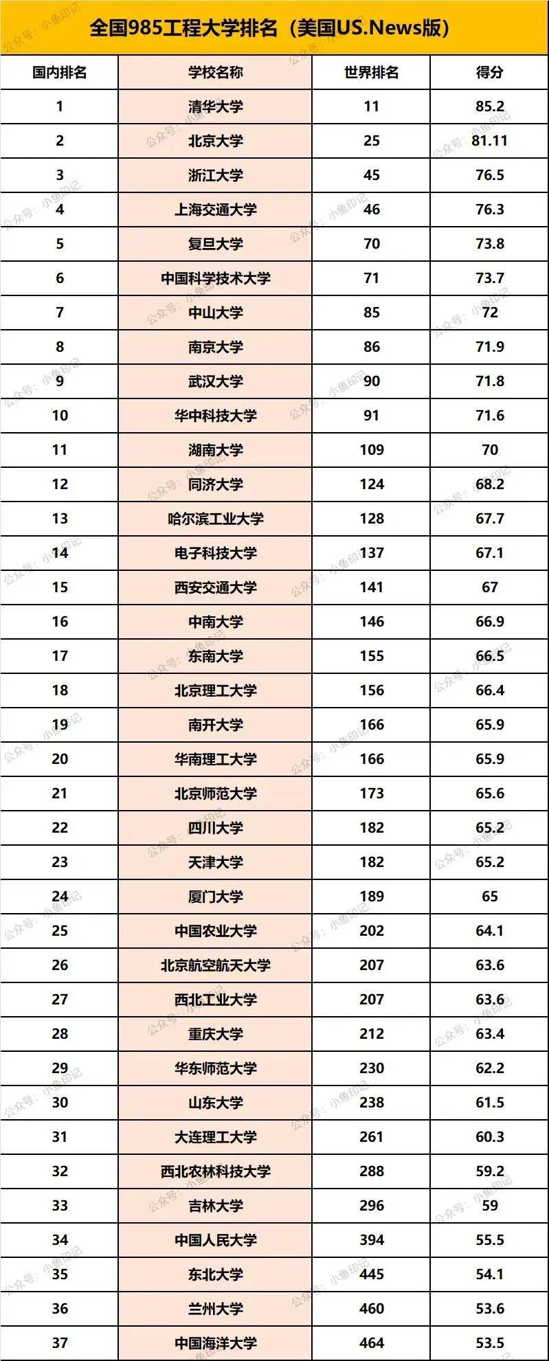 美国发布的中国985高校排名