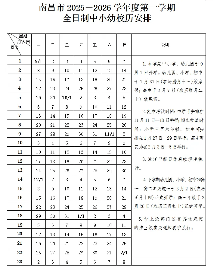 2026年春季学期,赣州全市幼儿园、小学、初中、中职学校及普通高中高一、高二年级于2026年3月2日正式开学;普通高中高三年级于2026年2月26日开学。