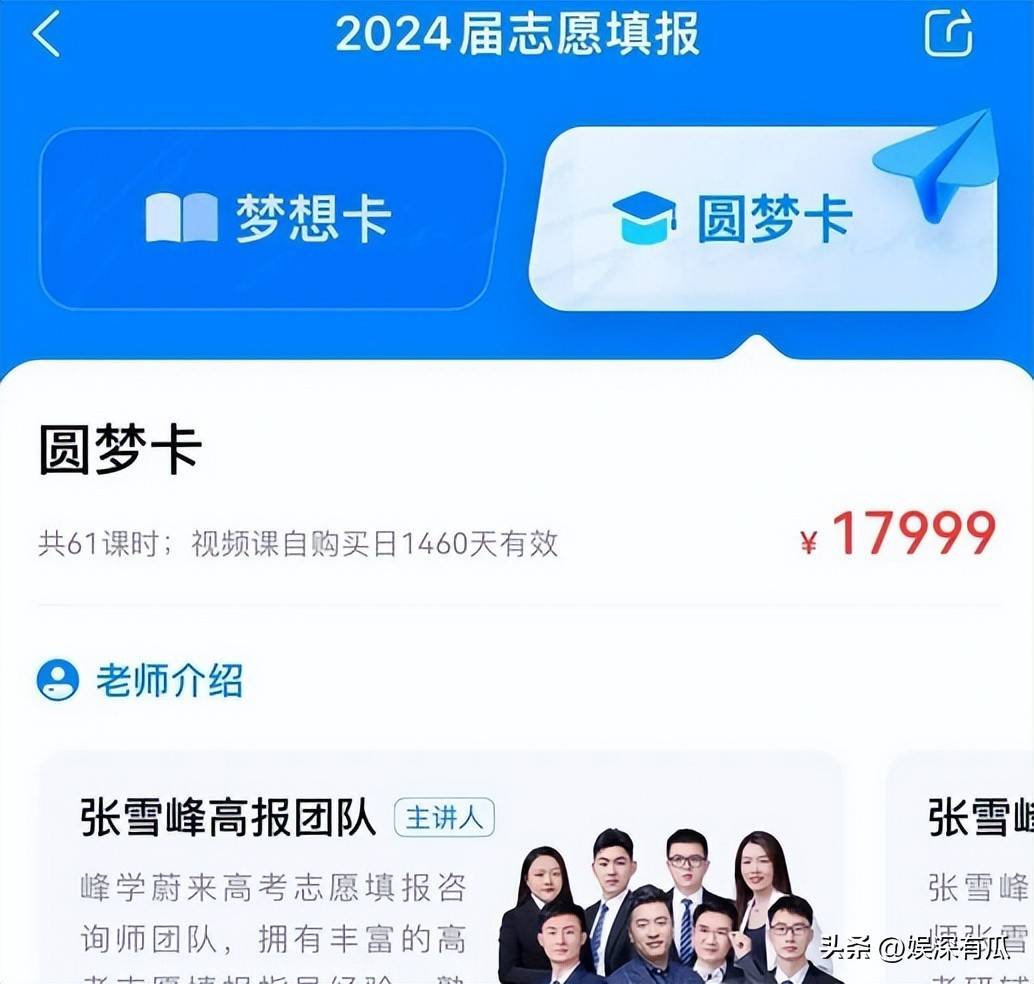 可老话说得好,水满则溢,月盈则亏。不知道是不是被流量和掌声捧得有点晕了头,张老师慢慢好像有点跑偏了。当初那个为寒门学子操心的形象,似乎悄悄蒙上了一层灰尘。他推出的志愿填报服务,价格高得让人咋舌,一个基础套餐就要一万三,高端卡更是直奔一万八去。这价钱,都快赶上一部分大学四年的学费了。可偏偏就有家长愿意掏这个钱,大概也是病急乱投医,孩子的前程嘛,总觉得贵有贵的道理。张老师显然是摸透了这份心理,赚得是盆满钵满。