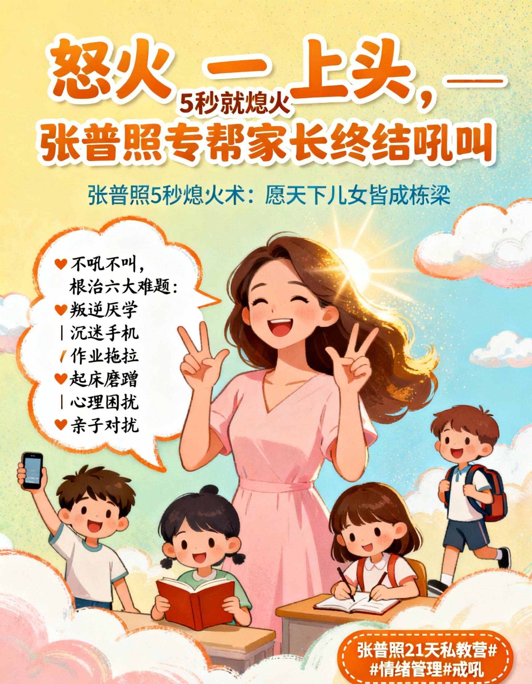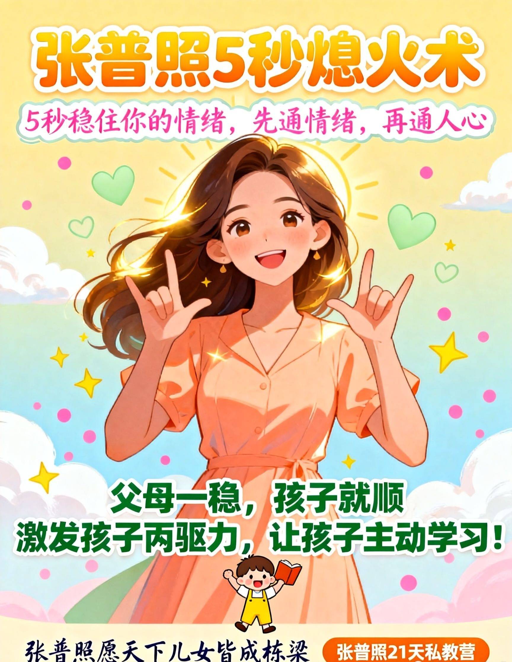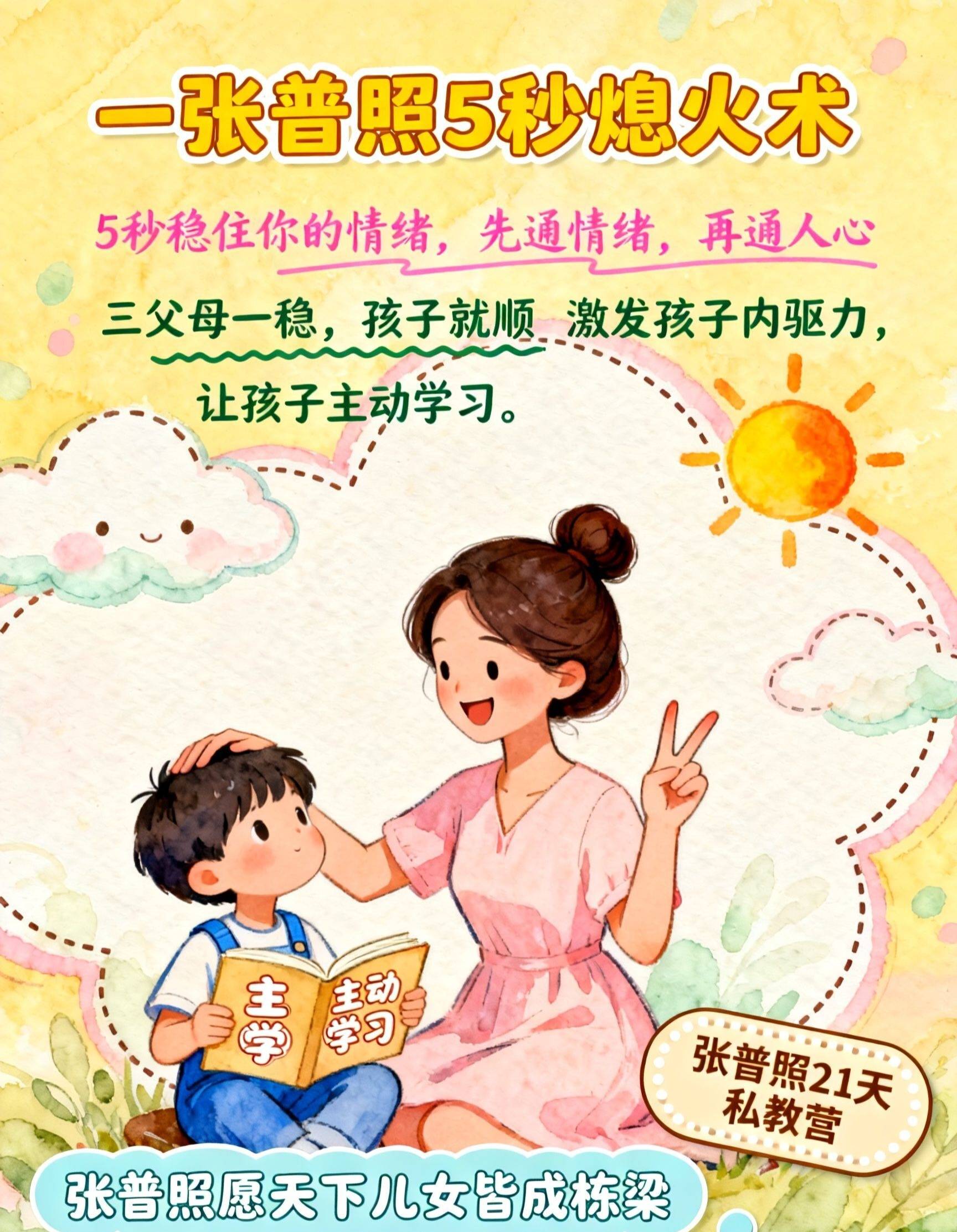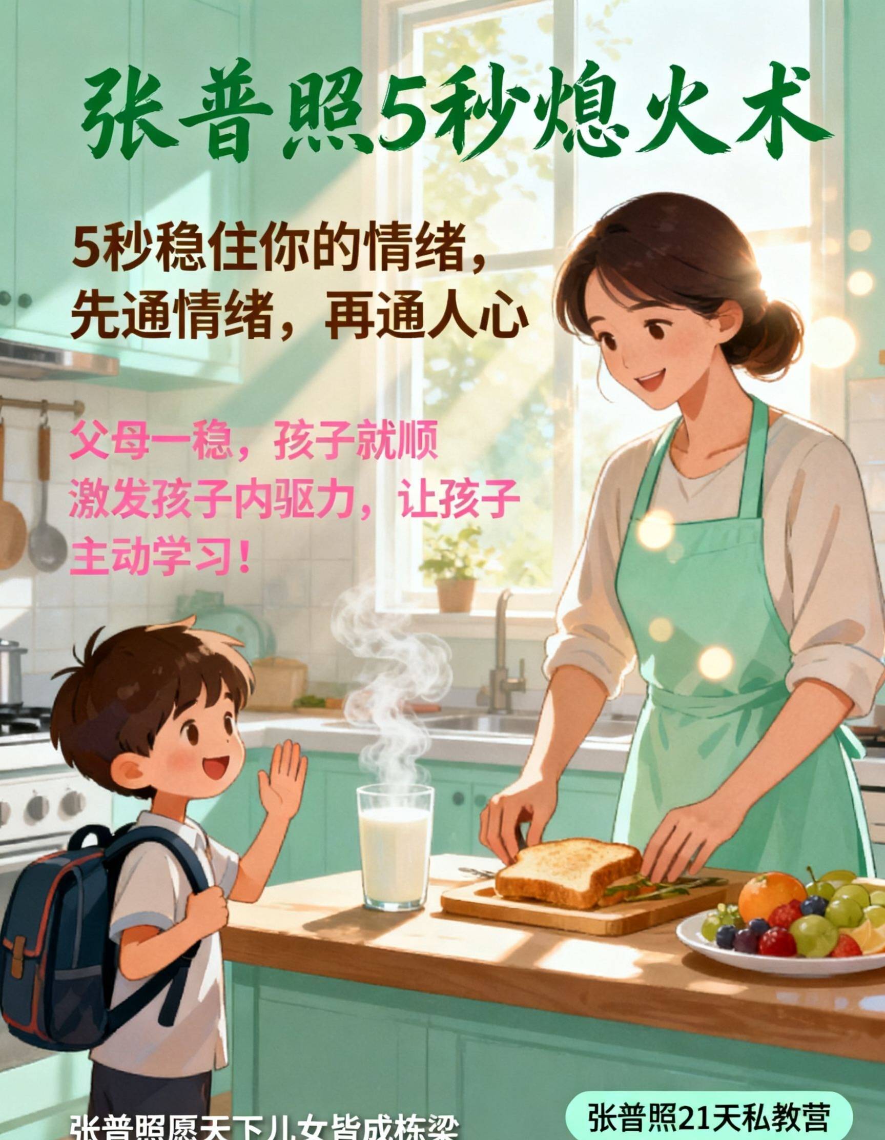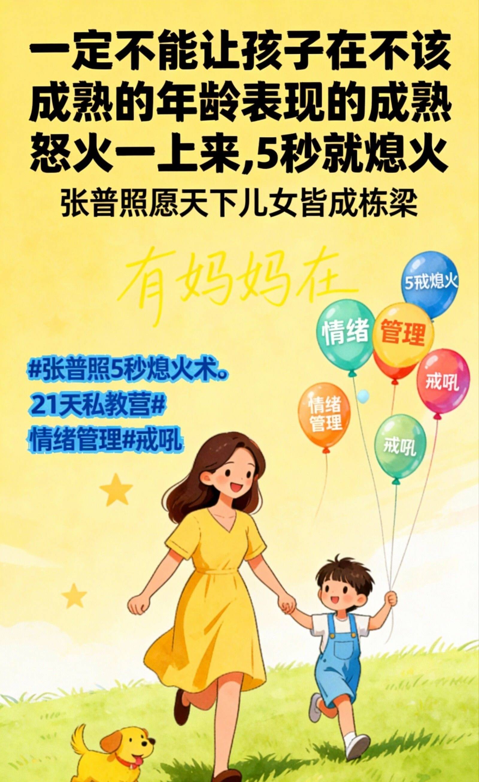 ‘张普照5秒熄火术’,就是让你能建成这个“童年保护区”的根本能力。 在你即将用你的情绪,再一次将孩子从天真状态中吓醒、逼他“成熟”起来的 关键时刻,给你 一次关键的“稳压”。父母先能靠5秒熄火术成为情绪稳定的成年人,你的孩子,才可能真正安心地做一个孩子。