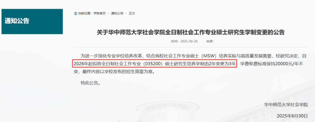 6月30日,华中师范大学发布《关于华中师范大学社会学院全日制社会工作专业硕士研究生学制变更的公告》,其中明确提到,自2026年起拟将全日制社会工作专业(035200)硕士研究生培养学制由2年变更为3年。