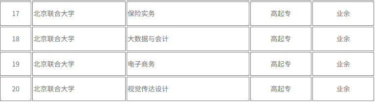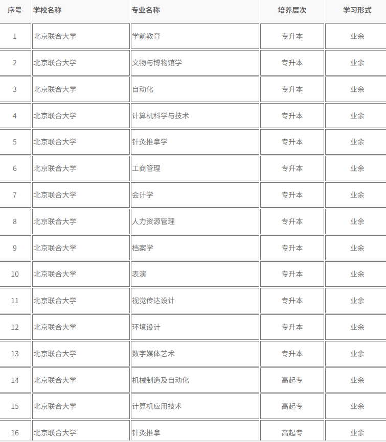 序号学校名称专业名称培养层次学习形式1北京联合大学学前教育专升本业余2北京联合大学文物与博物馆学专升本业余3北京联合大学自动化专升本业余4北京联合大学计算机科学与技术专升本业余5北京联合大学针灸推拿学专升本业余6北京联合大学工商管理专升本业余7北京联合大学会计学专升本业余8北京联合大学人力资源管理专升本业余9北京联合大学档案学专升本业余10北京联合大学表演专升本业余11北京联合大学视觉传达设计专升本业余12北京联合大学环境设计专升本业余13北京联合大学数字媒体艺术专升本业余14北京联合大学机械制造及自动化高起专业余15北京联合大学计算机应用技术高起专业余16北京联合大学针灸推拿高起专业余17北京联合大学保险实务高起专业余18北京联合大学大数据与会计高起专业余19北京联合大学电子商务高起专业余20北京联合大学视觉传达设计高起专业余