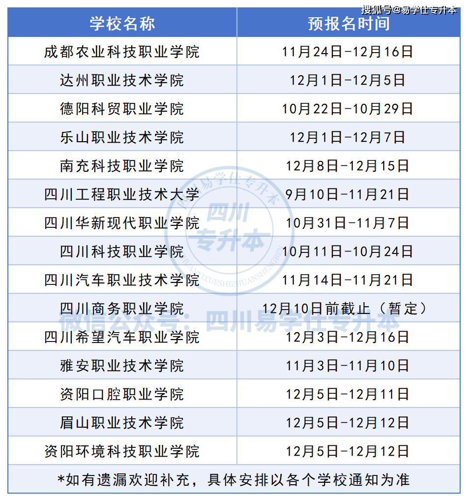 目前部分院校通知了2026年四川专升本预报名,学校还没开始预报名的同学不用着急,辅导员会通知大家的,还没通知就是学校还没开始预报名工作。