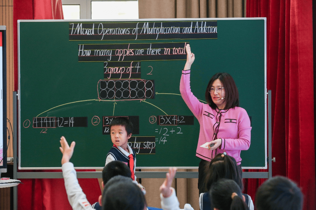 丰玲玲老师执教的题为“Mixed Operations of Multiplication and Addition”双语数学课,通过创设学生“买水果”的生活情境,让学生发现数学信息、图示数量关系、写出数学算式,有效发展了学生的数学探究能力和提出问题的能力。学生在解决英文数学题的过程中,不仅能用英语有条理地表达自己的思考过程,还能借助情境理解乘法与加法混合运算的顺序与意义,理解和掌握了“先算乘法,再算加法”的运算顺序,将英文作为数学学习与实践中的工具语言,学会了用数学的眼光观察世界,用数学的思维思考世界,用数学的语言表达世界。