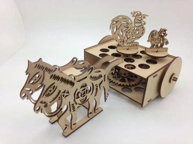差动齿轮是一类比较复杂的齿轮系统,只讲理论学生很难真正理解。为此,高云峰特意亲手做了一个指南车。车上面原本是一个木人,他将其改装为“马拉公鸡”的装置,具有相同的指南功能。运转演示过程中,同学们看到“无论车身如何转向,车上公鸡始终指向南方”,更直观地理解了差动齿轮如何抵消车身转动的影响。