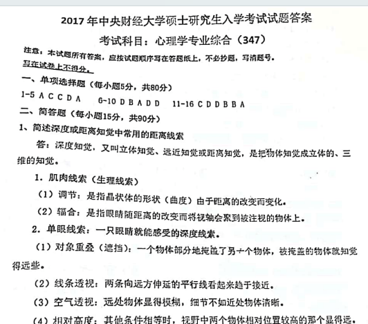 2017年中央财经大学347心理学专业基础综合考研真题试卷与参考答案
