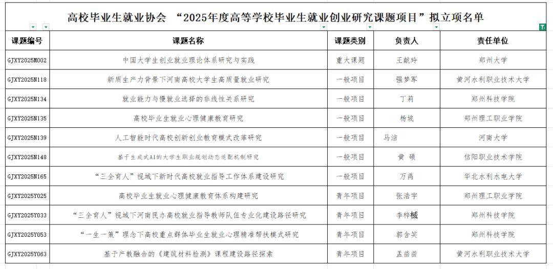 ■近日,高校毕业生就业协会2025年度规划课题拟立项名单公示,经自主申报、资格审查、课题评审专家组评审、课题评审委员会会审,拟立项273项课题。其中,河南多所高校课题入选。