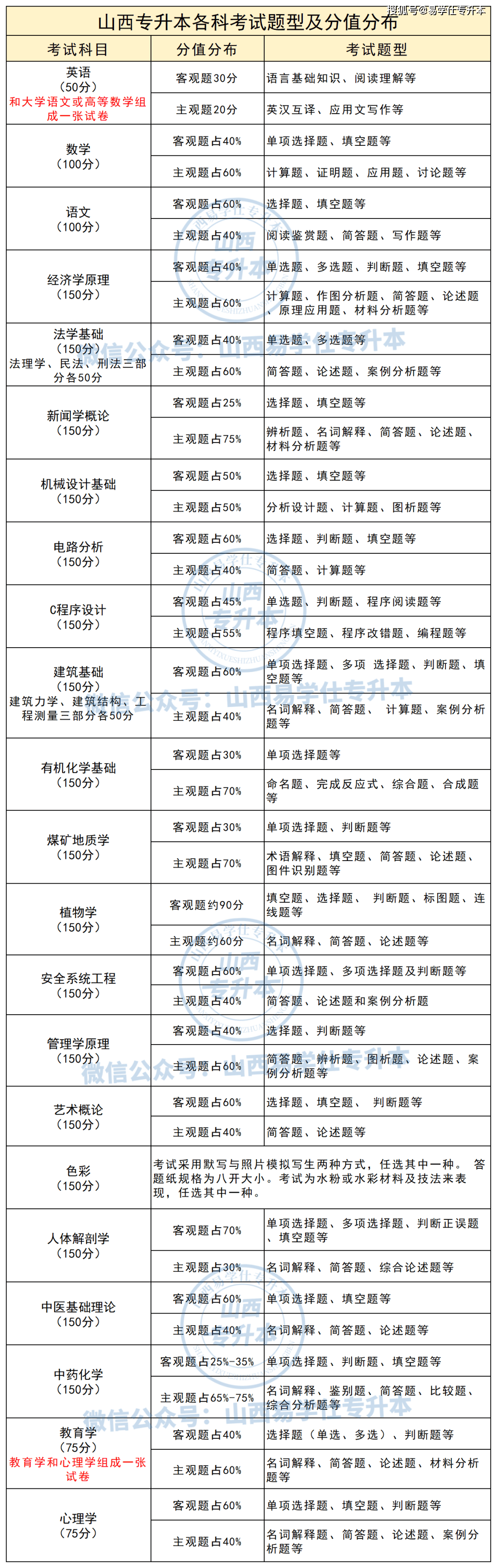 今天给大家整理了山西专升本各科考试题型和分值分布,同学们可以提前参考:
