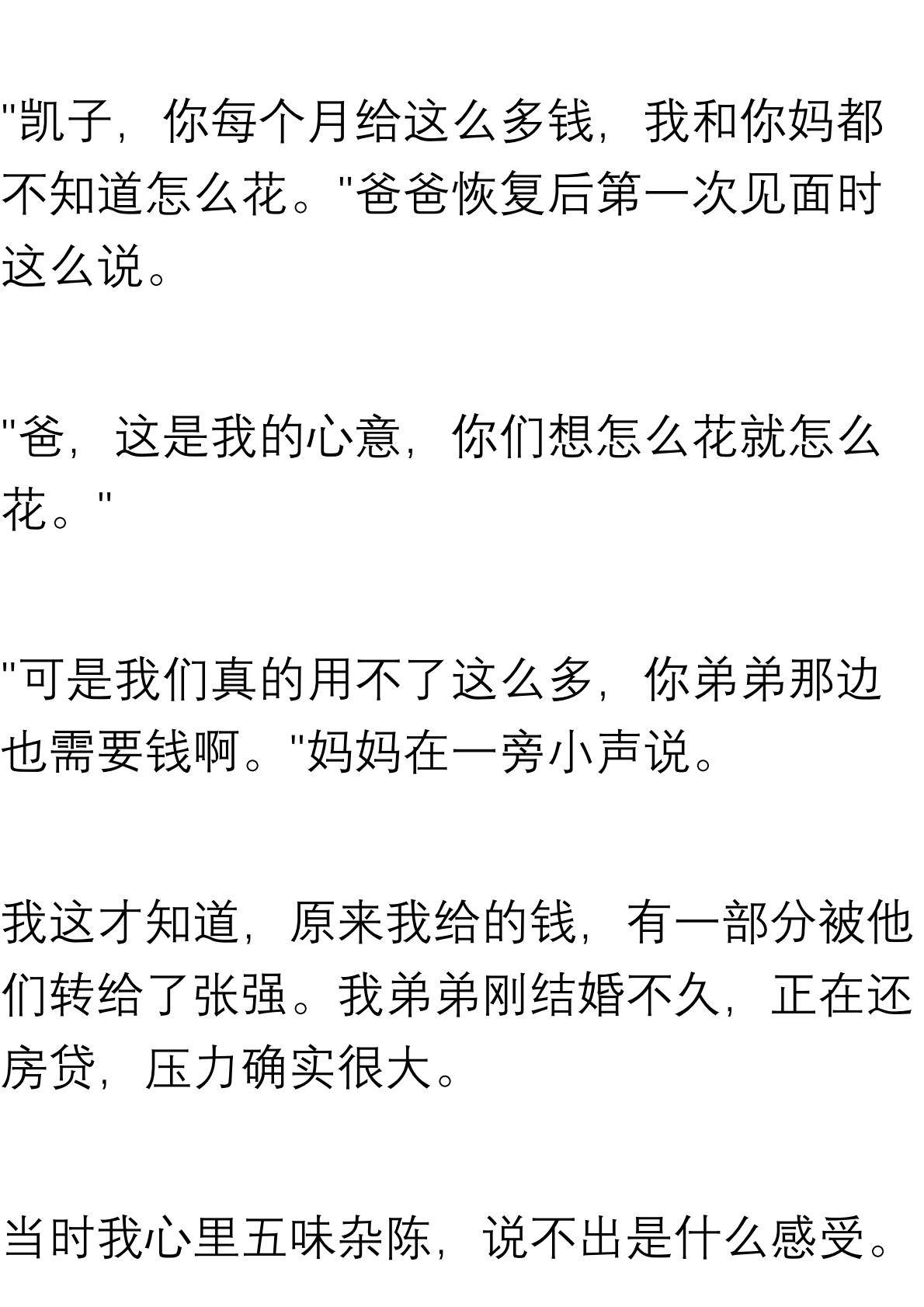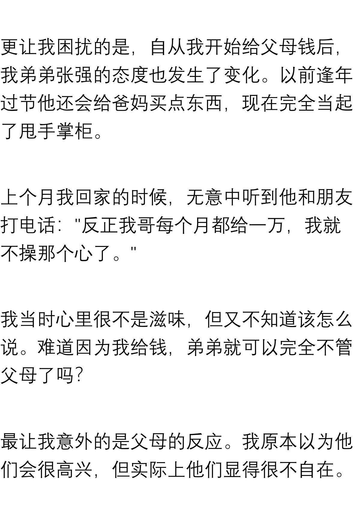 三个月后,张强因为没有了每月一万的"救助",开始主动承担起照顾父母的责任。虽然他起初很不满,但最终还是接受了现实。