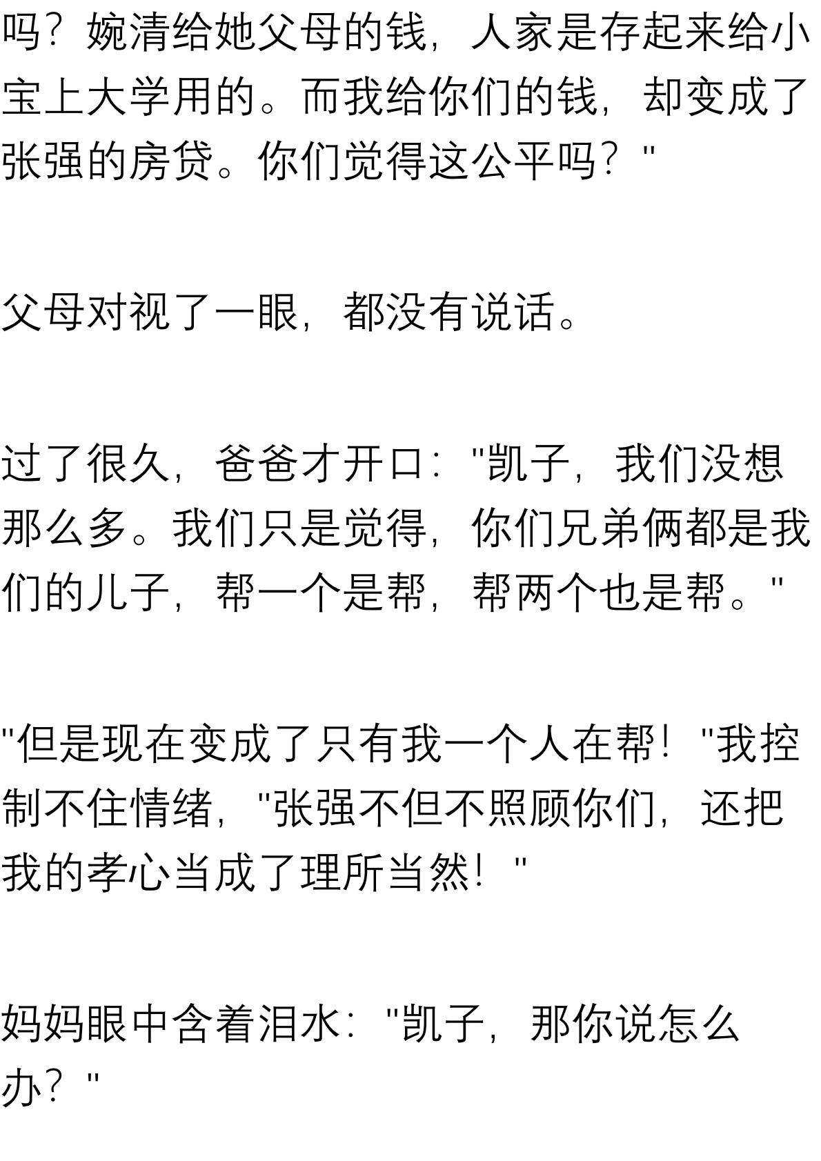"我的意思是,我们都需要重新考虑这个问题。"婉清坐到我身边,"我给我爸妈钱,他们确实是存起来的,主要是为了小宝将来的教育费用。但你给你父母钱,他们却转给了张强,这确实不公平。"
