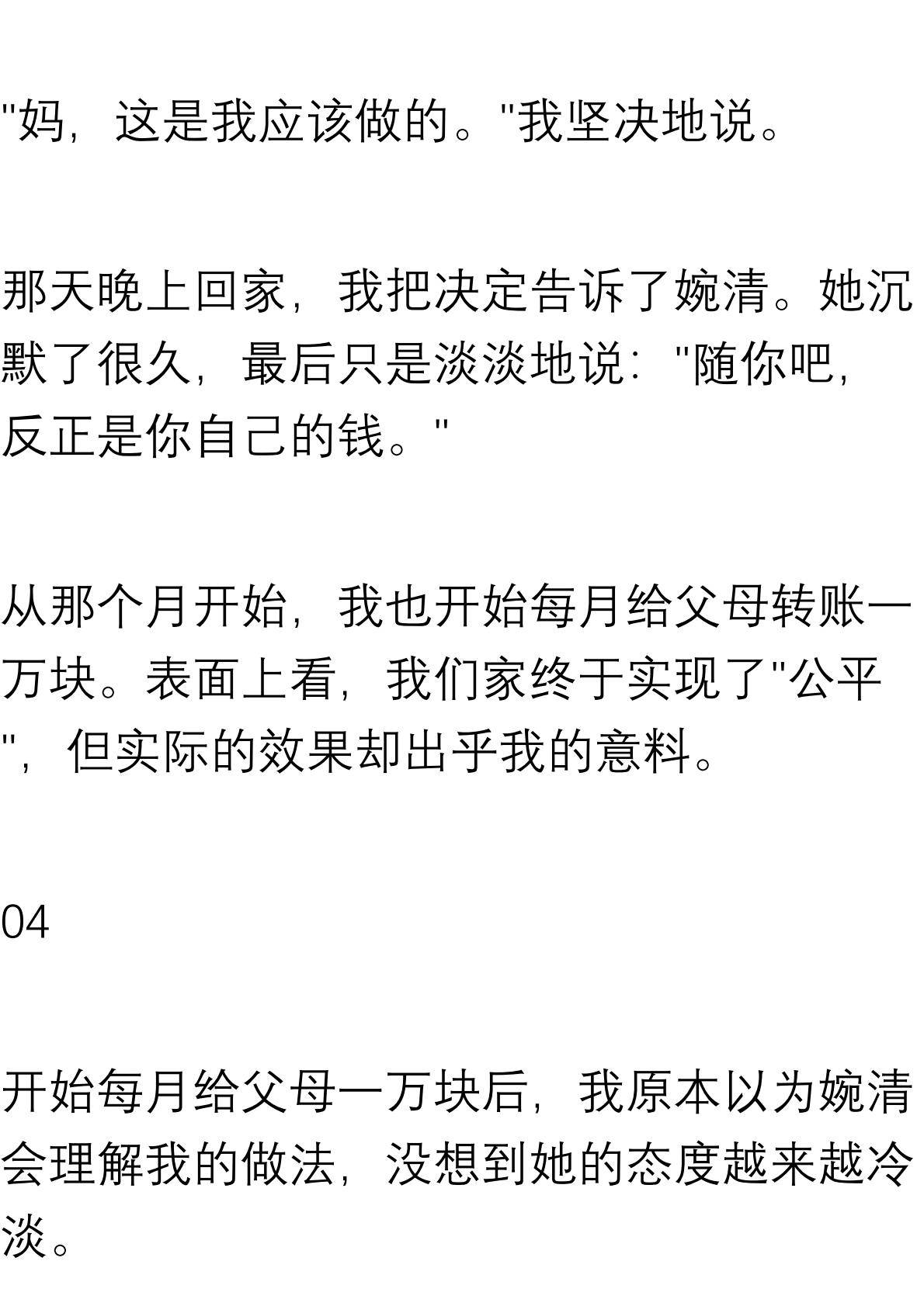 我想了想说:"你父母把钱存起来给小宝用,这其实也是对我们家的贡献。但我希望这件事能够透明一些,不要让孩子觉得两边的差距太大。"