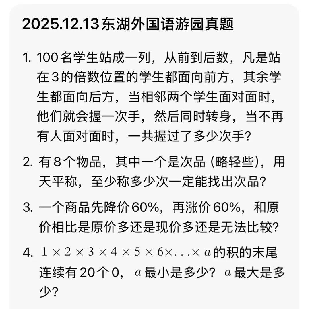 近期,多所初中学校开始行动,纷纷组织游园活动,目前已知东湖外国语学校、点睛学校、华美实验学校已经组织游园,小江搜集整理回忆版试题,供大家参考使用。