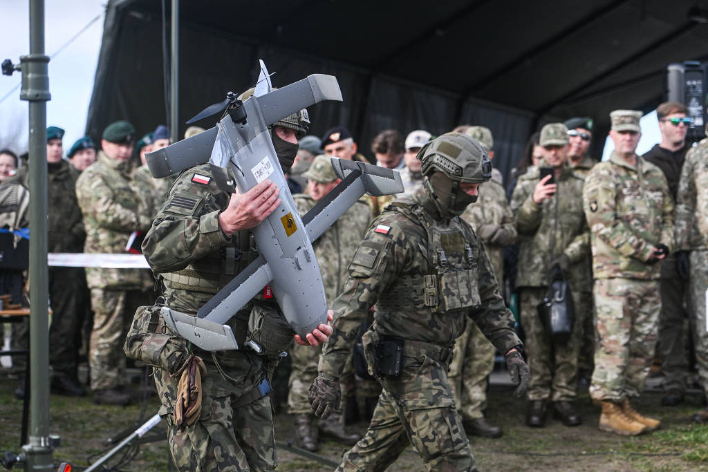 当地时间2025年11月18日,波兰新德巴,北约反无人机系统实弹演习期间,一名波兰士兵携带Merops无人机。此次演习由波兰国防部主办,波兰士兵与罗马尼亚和美国军队完成了在乌克兰成功使用的反无人机系统训练。北约成员国波兰和罗马尼亚部署了这些系统,作为“东方哨兵行动”的一部分,这是北约对俄罗斯无人机近期侵入欧洲领空的回应。视觉中国 图