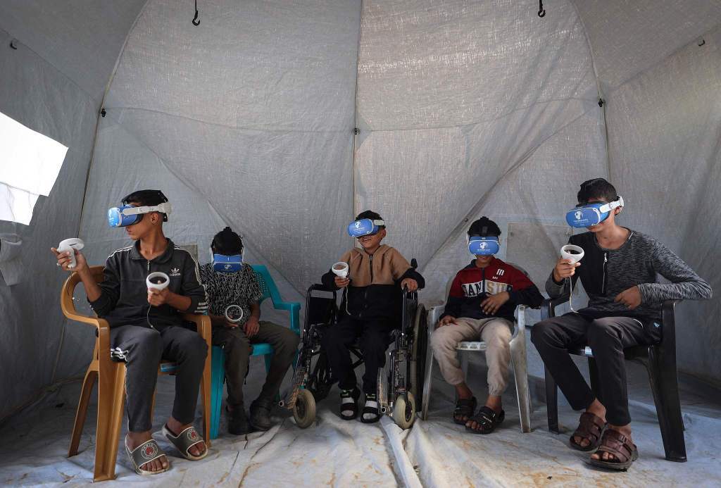 当地时间2025年11月30日,加沙地带扎瓦伊达市,儿童通过虚拟现实技术缓解战争创伤。这些疗程是专门为受创伤儿童设计的,考虑他们的身心状况,并帮助他们重建对世界的积极认知。视觉中国 图