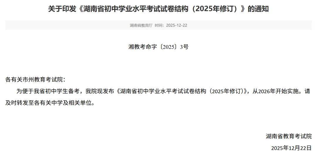 中考改革的风吹来了。2025年12月22日,湖南省教育考试院发布了一则重磅政策——正式印发了《湖南省初中学业水平考试试卷结构(2025年修订)》。
