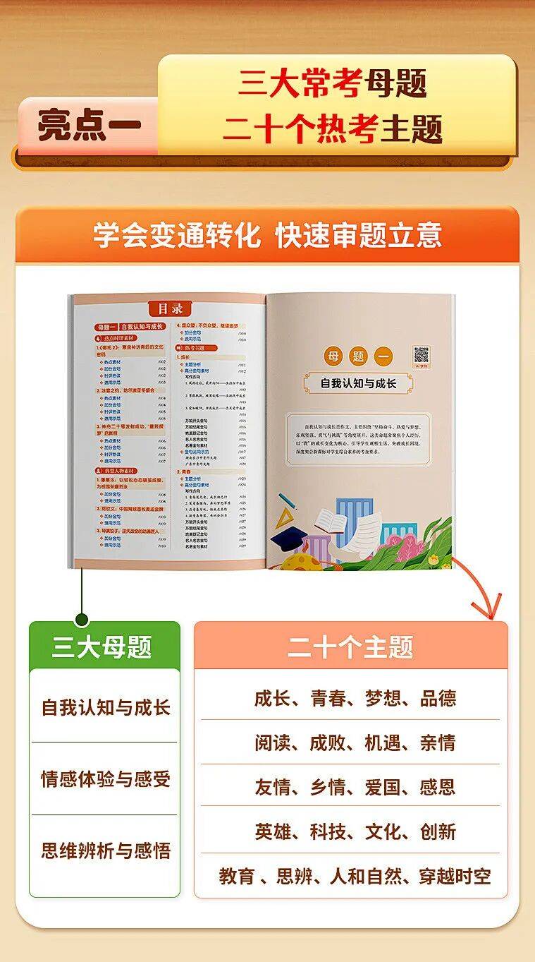 3大母题+20个热考主题,精准对标中考命题趋势,不管遇到什么题目都能快速找对素材。
