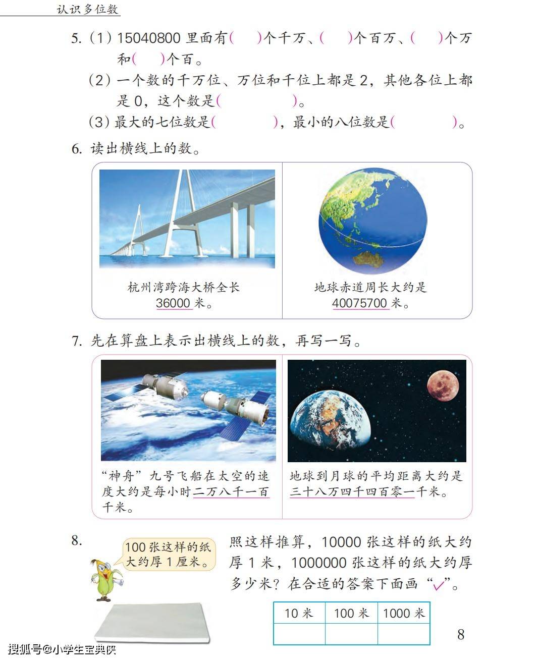 教材开篇以 “认识多位数” 为起点,通过芝麻、茶叶等农产品产量的真实数据,引入万级、亿级的数的认识。借助算盘拨珠、数位顺序表等工具,学生能直观理解 “10 个一万是十万”“每四个数位为一级” 的十进制规则,同时通过 “杭州湾跨海大桥长度”“地球赤道周长” 等实例,感受大数在生活中的应用。“三位数乘两位数” 单元则延续生活化设计,以 “文具店采购” 等场景引导学生探索竖式计算方法,结合运算律进行简便运算,既提升计算效率,又深化对乘法本质的理解。