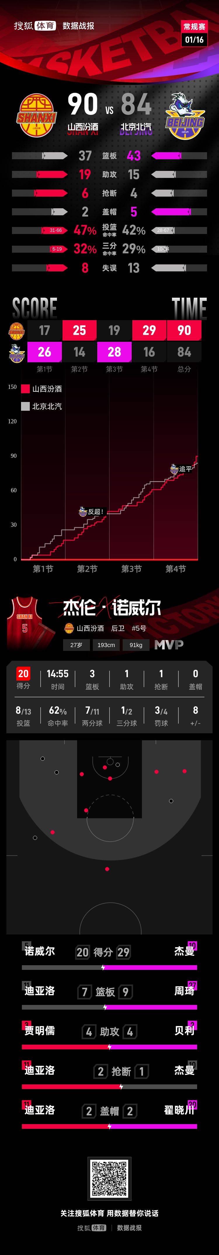 【搜狐体育战报】北京时间1月16日CBA常规赛第15轮,凭借着第四节的出色发挥以及张宁的关键球,客场作战的山西汾酒以90-84逆转击败北京北汽。杰伦·诺威尔20分3篮板1助攻,尤金·杰曼29分4篮板3助攻。