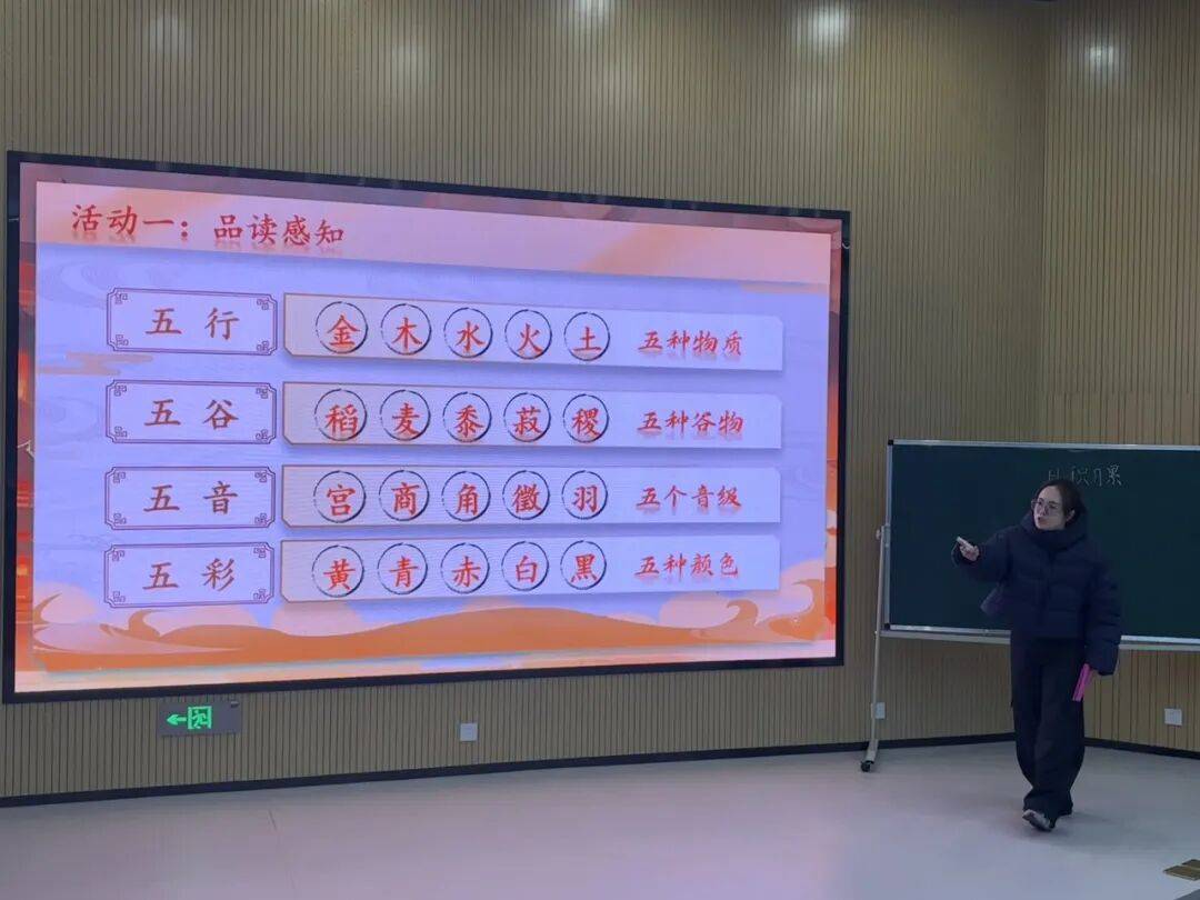 张慧老师在六年级上册《语文园地六“日积月累”板块》课堂上,聚焦五行、五谷、五音、五彩等传统文化知识,解析各类文化内涵、象征意义及汉字或音律关联,结合现代美食、绘画、服饰、疗愈等生活场景拓展应用。学生在积累传统文化常识的同时,体会古今文化联结,深化文化认同,提升传统文化素养与知识应用能力。