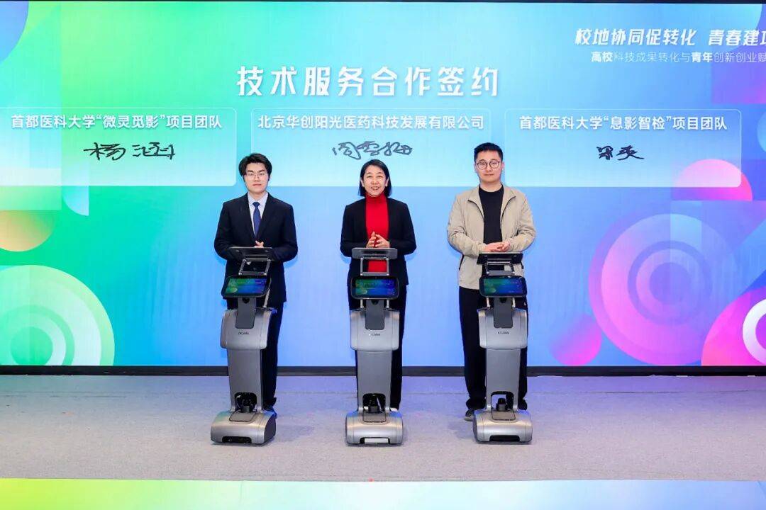 本次活动聚焦大兴区六大主导产业,邀请8个高校优秀创新创业项目进行现场路演,科技创新成果涵盖飞行汽车、超高压装备、肿瘤检测、氢能技术等前沿领域,精准对接大兴区域产业升级需求。活动现场还举行了2项基地共建签约仪式:北京航空航天大学与礼贤镇共建“青春赋能乡村振兴实践基地”,首都医科大学基础医学院团委与北京华创阳光医药科技发展有限公司共建“青年创新创业实践基地”,推动校地合作向平台化、长效化迈进。此外,来自北京科技大学、北京邮电大学、首都医科大学、北京科技职业大学等高校的5个项目与大兴区重点产业园及企业签约,涵盖技术服务、人才培养、横向课题、技术转让等多种模式,展现成果转化的多元路径,以实质性合作促进校地合作。本次活动现场专门设立政策解读与资源对接专区,来自大兴区内各重点产业园、龙头企业代表与项目团队开展多轮“一对一”洽谈,推动政策“面对面”送达。