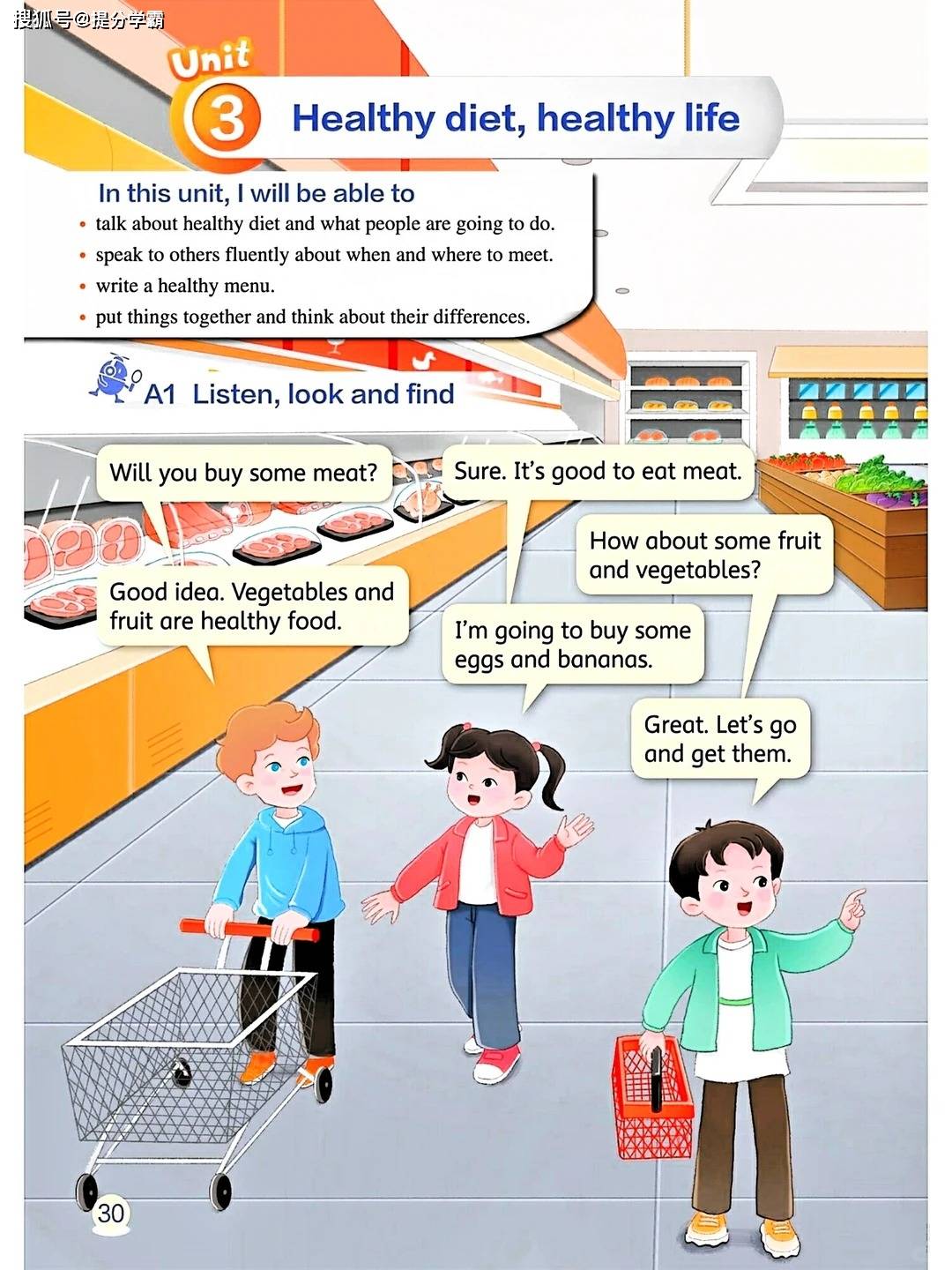 教材包含 6 个主题单元,从 “My favourite festival”(我最爱的节日)、“Family time”(家庭时光)到 “Healthy diet, healthy life”(健康饮食,健康生活)、“Everybody works”(每个人都在工作),再到 “The sun rises every day”(太阳每天升起)、“Everybody needs a home”(每个人都需要一个家),全面覆盖了日常交际、文化认知与生活常识等内容。每个单元以清晰的学习目标开篇,通过 “Listen, look and find”“Try to say” 等板块,让学生在真实情景中积累词汇、练习句型,例如第一单元围绕春节、端午节等中西方节日,学习 “What's your favourite festival?” 等交际用语;第三单元则在超市购物的场景中,掌握 “Will you buy some meat?” 等实用表达。教材还配套了词汇表与常用表达附录,帮助学生系统梳理知识。
