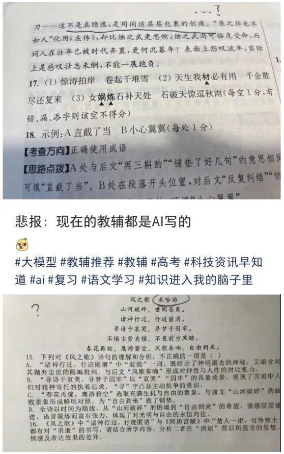 比如做阅读理解,经常出现高度疑似AI 的 “不是……而是……”奇妙小句型。甚至有的古诗词赏析题,出题AI直接把游戏公司的文案当成了古诗词,作者栏居然写着米哈游。。。