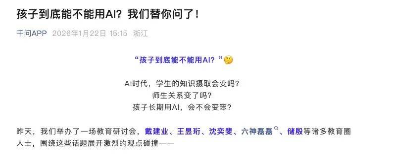 于是前两天,他们真在北京搞了一场《孩子到底能不能用AI》的教育研讨会。作为千问老用户,哥们我当然也去云参会了一把。