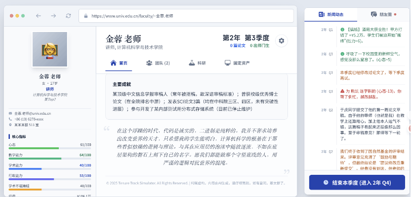 一开始那只是一个漆黑的赛博空间,他们一点点将它填充。玩家要在六年内成为副教授,非升即走。每个季度结束,都会触发大模型生成的随机事件。有正经的,像是实验室数据丢失,大佬邀请合作;不乏抽象的,比如拿科研经费给女朋友买花被发现,他俩都觉得好玩。