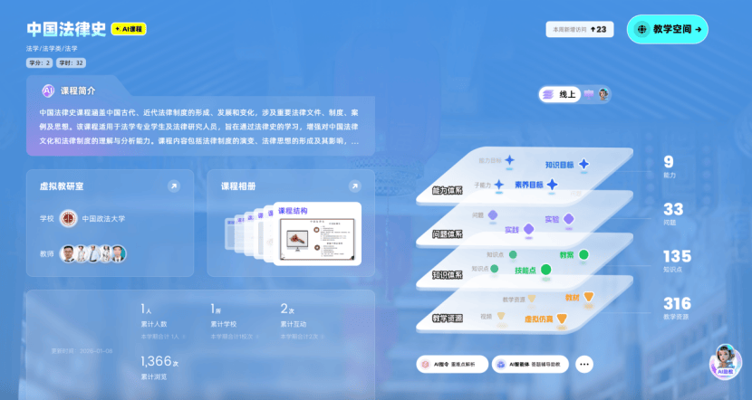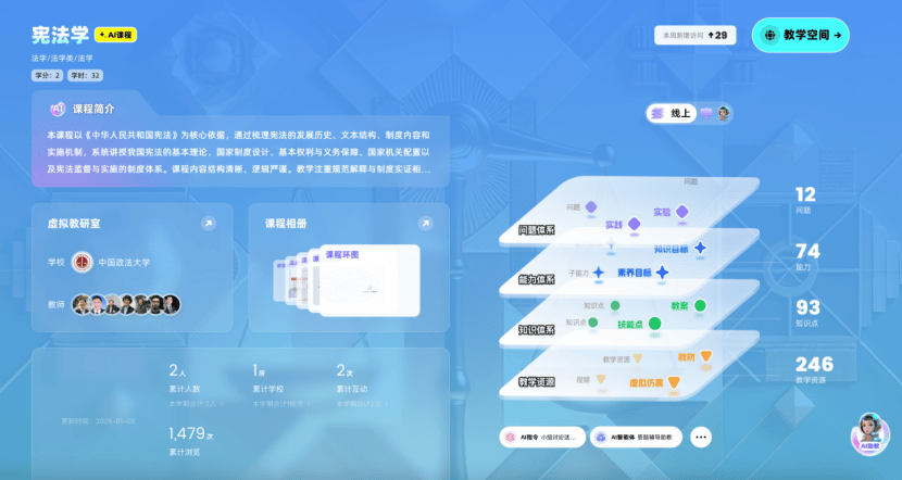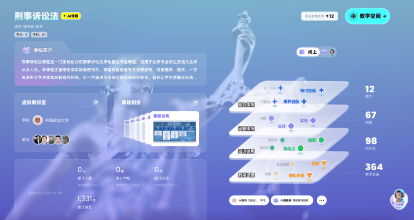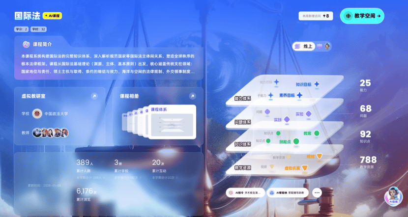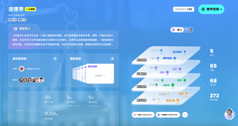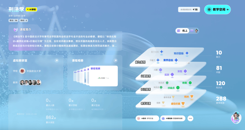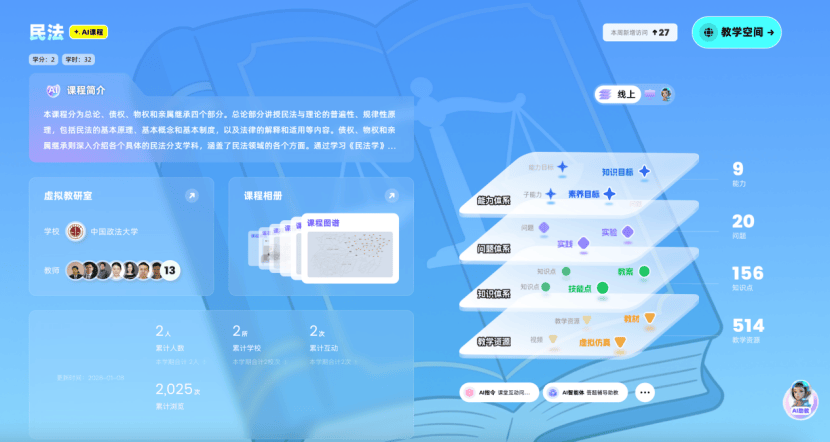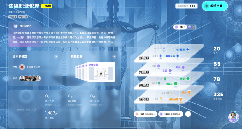 为深入贯彻《教育强国建设规划纲要(2024—2035年)》精神,落实“推进教育数字化,建设全民终身学习的学习型社会”战略部署,中国政法大学依托深厚法学底蕴与顶尖师资团队,建设11门法学核心智慧课程,同步接入AI大模型与知识图谱技术。此次课程建设深度融合人工智能与法学教育,构建“人工智能+法学教育”创新范式打造可视化的法律知识图谱与智能化教学闭环,为培养新时代德法兼修的复合型法治人才注入数字动能。