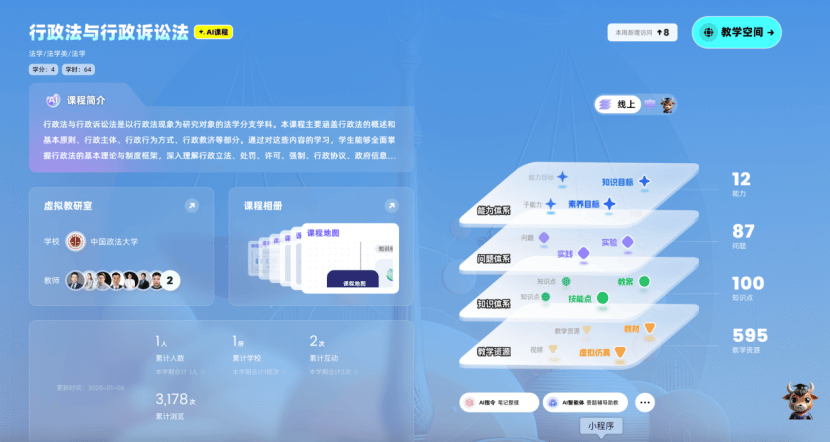 为此,本课程以习近平法治思想为指导,依据最新的“马工程”《行政法与行政诉讼法学》教材展开,聚焦“行政国家”时代行政权如何运作、如何约束、如何救济三大核心命题,涵盖行政主体、行政行为方式、行政复议与诉讼等关键制度。学生学习中,可依托AI智能助手实时获取关联知识点推送与拓展资料,并通过线上线下混合式教学参与实践,提升法治思维与实务操作能力。
