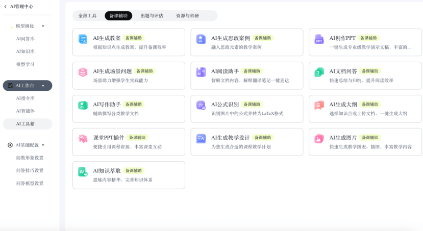 AI教学工具:覆盖备课、测评、资源查找、案例分析、学情追踪等全流程,支持自动生成教案、课程思政案例、创作教学PPT、教学周报生成等功能,辅助教师精准教学。