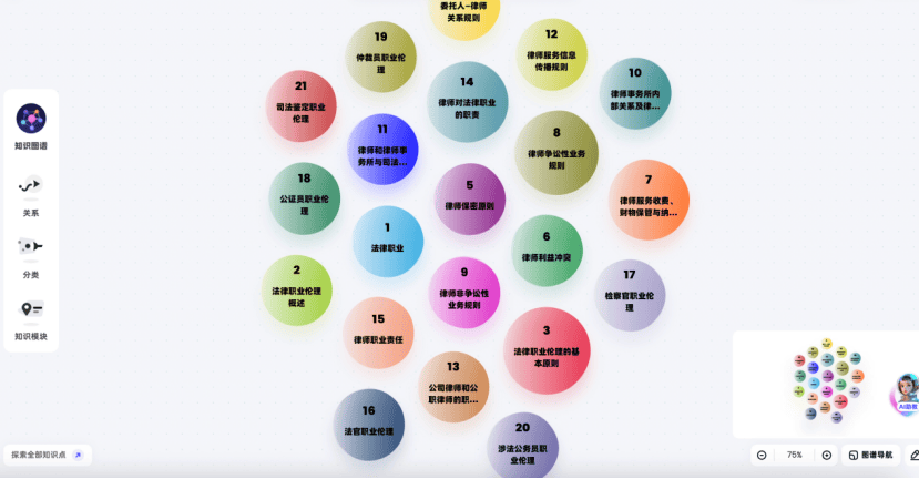 “智慧课程”依托知识图谱与人工智能技术,打造结构化、可视化的法律知识框架及智能化互动系统。通过知识脉络清晰呈现4000余个法学知识点层级与关联,个性化图谱助力学生实时观测学习进度,快速定位薄弱环节,针对性强化训练,全面提升教学质量与资源配置效率。
