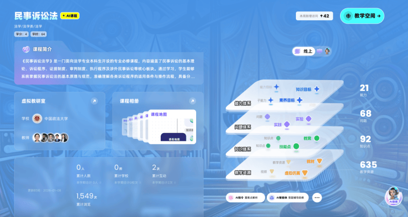 本课程系统构建“基础理论—基本制度—诉讼程序—特别程序—涉外诉讼”完整知识体系,涵盖管辖、证据、审判程序、执行等全流程内容,构建了12章549个知识点的智能图谱。通过案例分析和逻辑推理训练,培养学生的法律思维和职业素养,增强其法律分析、逻辑思维和实践操作能力。