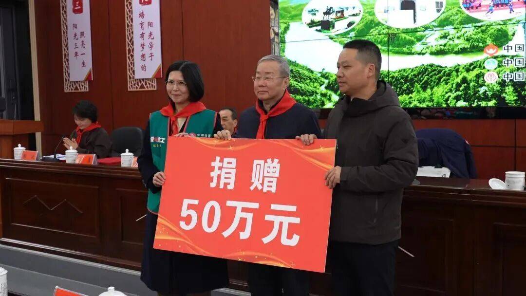 仪式上,少先队员代表向出席揭牌暨捐赠仪式的嘉宾敬献红领巾,中国关工委、中国信托慈善基金会向三阳中学捐赠50万元。