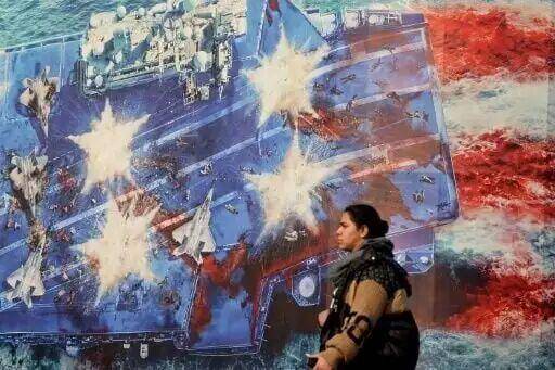 我看到,还有海报展示美国航母被摧毁的场景,文章的标题则是:“霸权的葬礼,美国决定攻击伊朗将是一场战略自杀”。