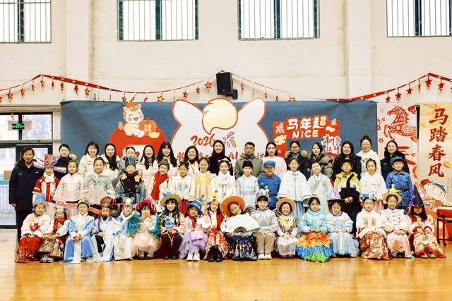 马年主题乐园氛围感拉满,一进篮球馆,“七艺训练营”“新春市集”两大情境格外吸睛,小马剪纸、新春福贴错落点缀,师生用废旧材料DIY的各类装扮,既环保又创意十足。孩子们化身“乐学小马骑士”与“新春市集小掌柜”,身着拜年服、汉服或cosplay课本人物造型服饰,佩戴亲手制作的特色头饰——有的点缀着灵动马尾,有的印着乘法口诀,有的融入课本角色元素,将语文、数学、美术、劳动等课程的学习成果,转化为独属于自己的个性化装扮。