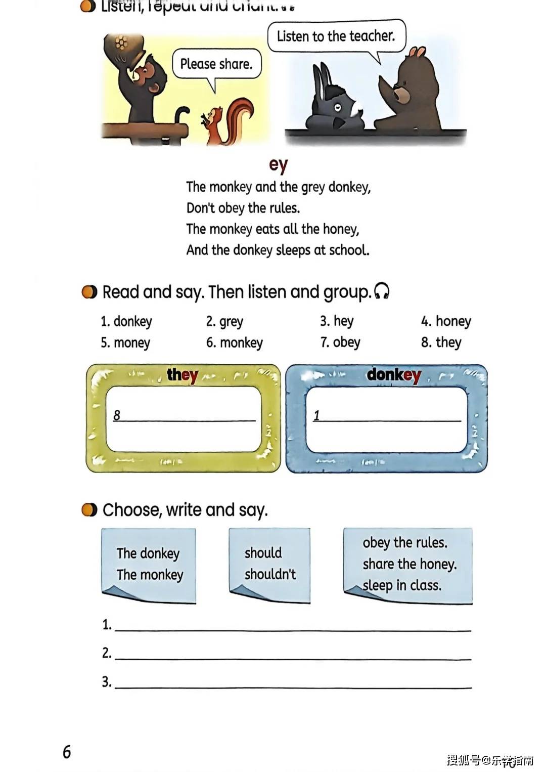 教材的设计注重 “语言运用 + 思维培养” 的双重目标。每个单元包含 “Let’s talk”“Let’s learn”“Let’s spell” 等板块,通过分层训练夯实基础。例如 “Let’s spell” 环节,以 “ey” 字母组合的发音规律为核心,借助歌谣 “The monkey and the grey donkey” 帮助学生掌握发音规则,实现 “见词能读、听音能写”;“Think, draw and talk” 活动则让学生通过绘制规则标识、小组分享的方式,将语言知识转化为实际运用能力,提升口语表达的流畅度与逻辑性。