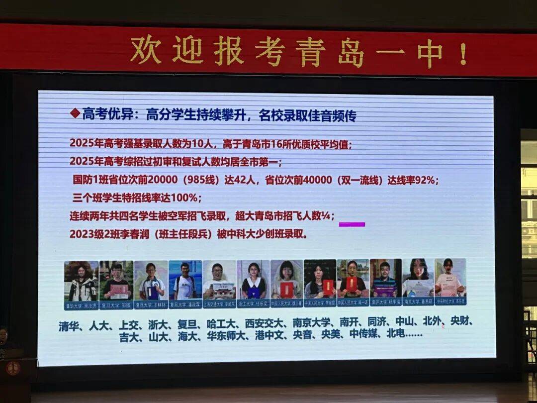 在宣讲中,青岛一中系统展示了2025届高考整体成绩与升学成果,多项数据表现亮眼: