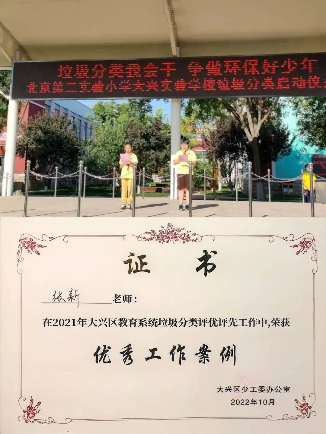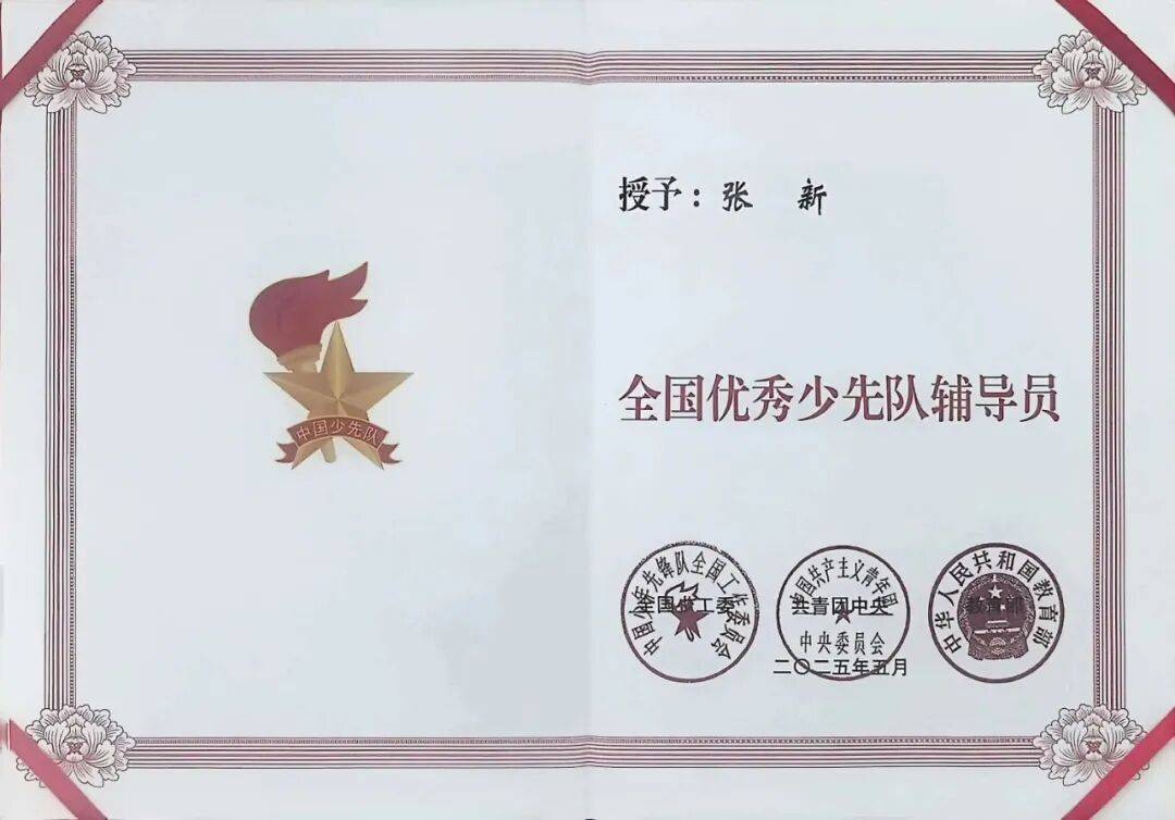 作为学校党办副主任,张新同志坚持“以研促教、以赛促精”,撰写的少先队课例、案例及科研成果先后获市、区级一等奖。在大兴区“星星火炬杯”少先队辅导员风采大赛中,以中队辅导员第一名的成绩获特等奖。凭借扎实的理论功底和实践创新,她连续2年获评大兴区“优秀辅导员”,2024年荣获大兴区“十佳辅导员”、北京市“优秀辅导员”称号,2025年荣获“全国优秀少先队辅导员”称号。