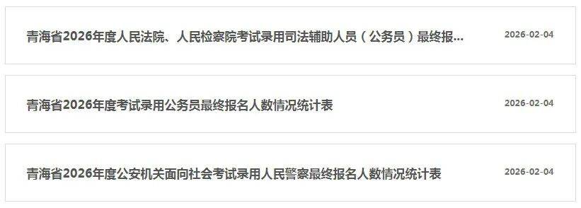 2月4日,青海省人事考试信息网发布青海省2026年度考试录用公务员最终报名人数情况统计表;青海省2026年度人民法院、人民检察院考试录用司法辅助人员(公务员)最终报名人数情况统计表;青海省2026年度公安机关面向社会考试录用人民警察最终报名人数情况统计表。