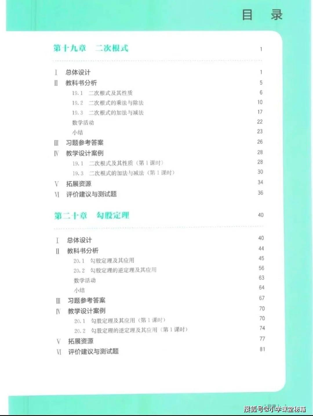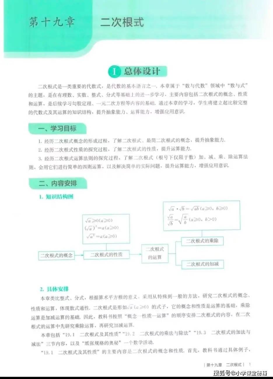 全书内容聚焦四大核心板块:一是二次根式,从概念、性质到加减乘除运算,通过知识结构图梳理逻辑,强调其作为代数式基础的地位;二是勾股定理,涵盖定理及其逆定理的应用,注重培养学生的几何推理和问题解决能力;三是四边形,系统讲解多边形、平行四边形及特殊平行四边形(矩形、菱形、正方形)的性质与判定,强化几何直观和空间观念;四是函数,从概念到表示方法,引导学生理解变量关系,为后续函数学习奠定基础。每章均包含总体设计、教科书分析、习题参考答案、教学设计案例、拓展资源和评价建议,同时通过 “观察”“思考”“探究” 等栏目,引导学生经历数学知识的形成过程,兼顾知识传授与能力培养。